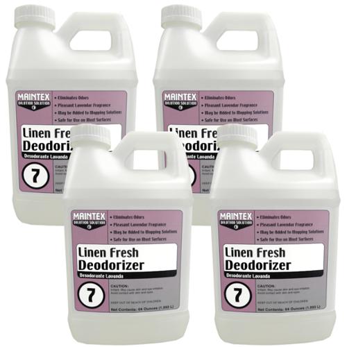 Pleasant linen fragrance. Surface or air deodorant for the elimination of malodors in bathrooms, trash receptacles or any area where disagreeable odors occur. Add to mopping solution and extraction or carpet shampoo solutions for effective deodorizing. Only for use in Maintex Dilution Solution chemical dispensers. 64 oz. Made in USA.