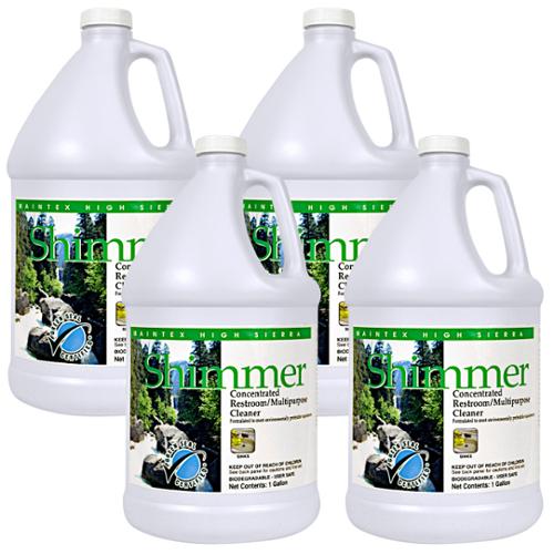 Green Seal Certified restroom and tile cleaner. Highly concentrated, formulated with hydrogen peroxide and safe detergents. Shimmer is a high performance cleaning product that will remove unpleasant odors, soap scum, body oils and urine deposits common in restroom environments. Safe for use on ceramic tile, porcelain, fiberglass, painted surfaces, stainless steel and chrome fixtures. Made in USA.
