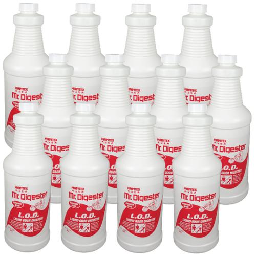 A seven strain bacteria formula, genetically engineered to produce enzymes that liquify solids, digests grease and organic waste to eliminate malodors at their source. Developed to work on hard surfaces such as concrete, grout, urine saturated animal pens, dumpsters and waste receptacles. Made in USA.