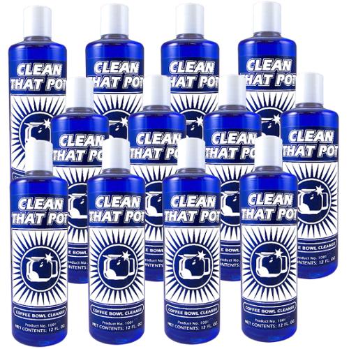Clean That Pot is a fast, easy and economical liquid cleaner for coffee bowls and other types of coffee equipment. It prevents oil build up, attacks coffee stains, and is odorless. It is environmentally safe and should be used daily. 12 oz Bottle. Made in USA.