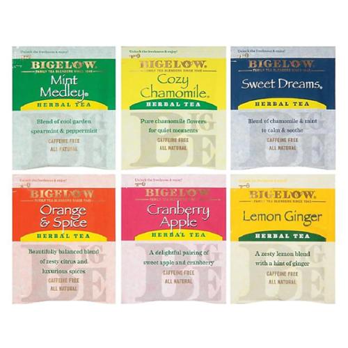 Make the work day more enjoyable by sipping on a hot cup of this caffeine-free herbal tea. With a wide assortment of flavors to choose from, these tea bags help add variety to the day. These bags of Bigelow assorted-flavor caffeine-free herbal tea are individually wrapped, keeping contents fresh and making it easy to prepare a quick beverage. Flavors include: Cozy Chamomile, Mint Medley, Lemon Ginger, Orange & Spice, Cranberry Apple, Sweet Dreams.