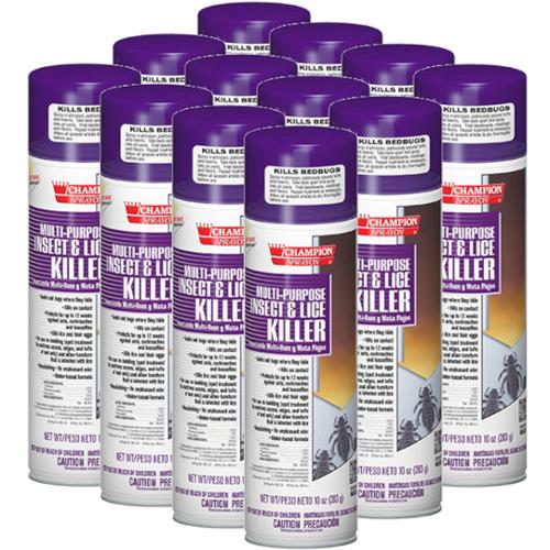 Champion Sprayon Multi-Purpose Insect and Lice Killer protects against ants, cockroaches and houseflies for up to 12 weeks. It is a water-based, non-staining formula. Sprayed indoors, it kills ants, bedbugs, carpet beetles, centipedes, cockroaches, crickets, firebrats, fleas, millipedes, palmetto bugs, pill bugs, scorpions, silverfish, sow bugs, spiders, ticks (including adults and larvae of those which may cause Lyme disease, and water bugs, as well as flying insects such as bees, blackflies, blowflies, cluster flies, fleas, fruit flies, gnats, hornets, houseflies, mosquitoes, skipper flies, small flying moths, and wasps. Use it outdoors to kill ants, centipedes, cockroaches (including Asian cockroaches), crickets, mole crickets and silverfish, and flies, gnats, hornets, mosquitoes, small flying moths, yellow jackets and wasps. 10oz can