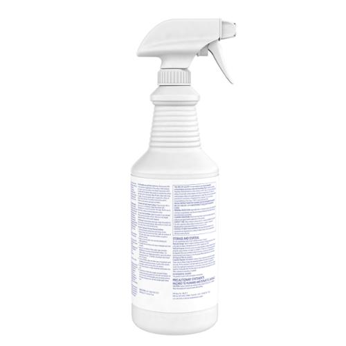 A ready-to-use, quaternary-based disinfectant that provides excellent cleaning and deodorizing in one step. Disinfects in three minutes. Kills Bactericide, tuberculocide, virucide, fungicide. Kills Norovirus, VRE and MRSA. Kills HBV and HIV-1 (AIDS virus) in one minute. Kills Tb in five minutes and all other bacteria in three minutes. Kills Norovirus in 30 seconds. Provides broad spectrum kill of gram positive and gram negative microorganisms, including Tb, MSRA, VRE, MRSE, HBV, HIV-1, Canine parvovirus and many more. Meets bloodborne pathogen standards for decontaminating blood and body fluids. Colorless with a lemon scent. 32 oz./946 mL spray bottle. Made in USA.