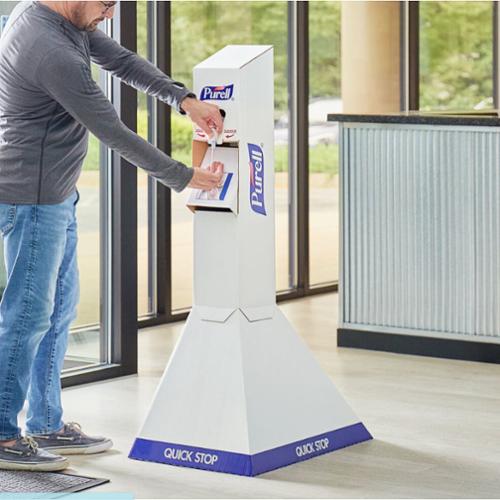 For fast, easy access to hand sanitizer, place this Purell 2156-02-QFS Emergency Response Quick floor stand around your establishment. This stand includes (2) 1 liter NXT Purell Advanced hand sanitizer gel refills so you can set up right away. Constructed of durable corrugate, this floor stand can be easily moved and placed around your establishment where it is needed most. Plus, it's recyclable so you can properly dispose of it after use.