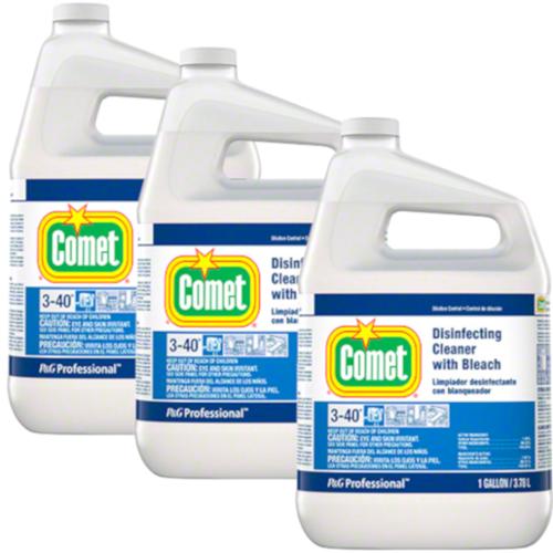 Comet Professional Multi Purpose Disinfecting Liquid Cleaner Spray with Bleach is designed for commercial use. It contains an all-purpose cleaner formula that combines the cleaning power of heavy-duty detergents with the stain-removal power of bleach spray. This, ready-to-use, Comet cleaner contains no abrasives and uses remarkable cleaning technologies on the full range of tough kitchen and restroom soils. Task areas for this multi-surface cleaner include customer and employee restrooms, tracked-in dirt, scuff marks, kitchen-area stains, plastic trash containers, and greasy equipment containers. Made in USA.