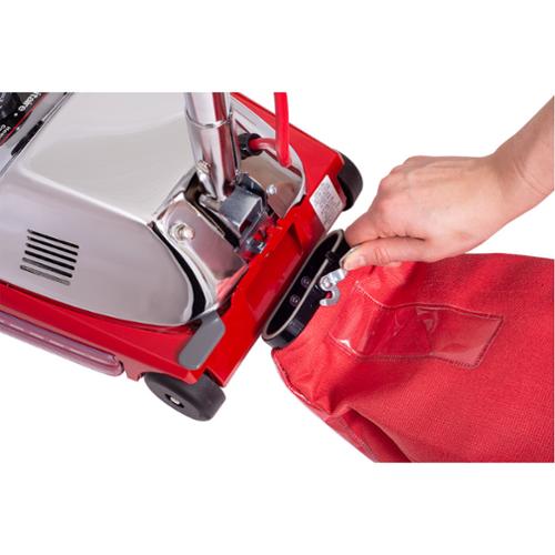 For large areas of carpet cleaning, 18-qt., large capacity vacuum keeps productivity high. No-Tools Bag Release System with metal bag clip makes emptying easy and saves money on bags. Re-engineered long-life motor and chrome steel brushroll with replaceable bristle strips is built to last and save money. A 12-inch cleaning path and 50-foot cord ensure that big jobs get done faster