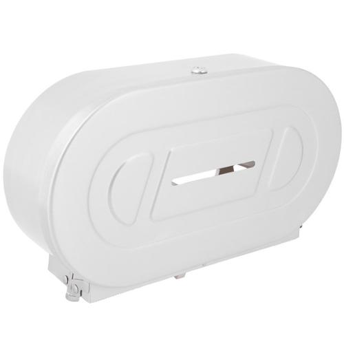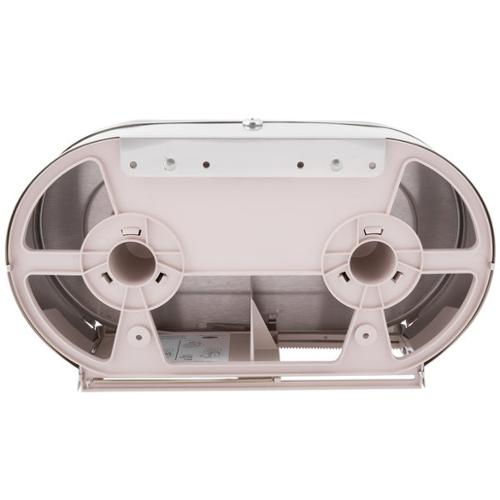 Satin-finish stainless steel. Equipped with tumbler lock. Spindles hold two 10" (255mm) diameter rolls with 2 1/4" (55mm) diameter core rolls; convertible for 3" (75mm) diameter core rolls. Sliding access panel exposes one roll at a time, allows easy roll change-over. Wide viewing slot in door. Quick reloading. Dimensions (WxDxH) 11.375" x 5.312" x 11.375".