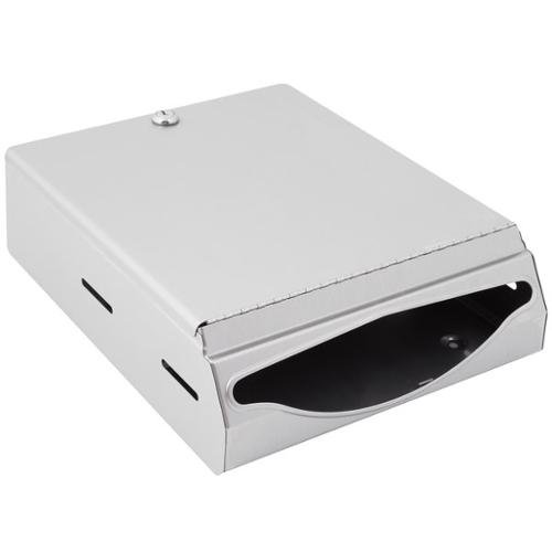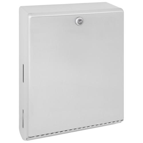 Satin-finish stainless steel. Dispenses 400 C-fold or 525 multifold towels. Door has tumbler lock and piano-hinge. Hemmed towel tray opening. Dimensions (WxDxH) 10.750" x 4.000" x 14.000".