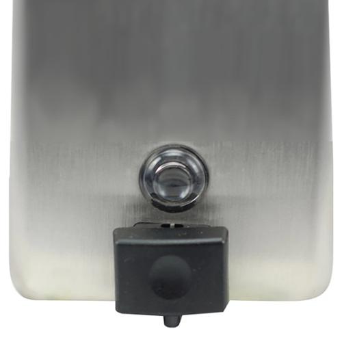 Vertical tank is satin-finish stainless steel. Valve dispenses all-purpose hand soaps. Capacity: 40-fl oz (1.2-L). Soap refill window. Concealed wall fastening. Hinged filler-top requires special key to open. Vandalresistant. Unit 4 3/4" W, 8 1/8" H (120 x 205mm); wall to push-button, 3 1/2" (90mm).