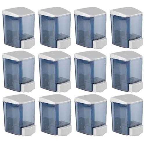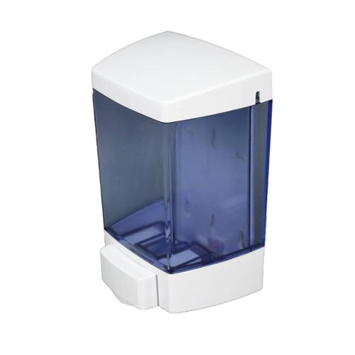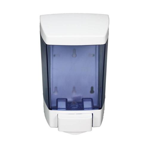 Unique water-resistant top, ideal for showers. Smooth, curved design prevents bacteria growth. See-through tank allows easy view of soap level. Accommodates a wide variety of liquid and lotion soaps, except pumice. Large push bar meets ADA requirements. Hidden, removable backplate. Hidden security key lock prevents vandalism. 46-oz. capacity. 5-1/2w x 4-1/4d x 8-1/2h. White. Made in USA