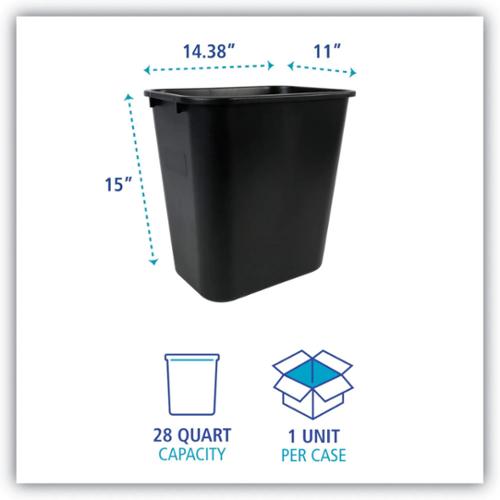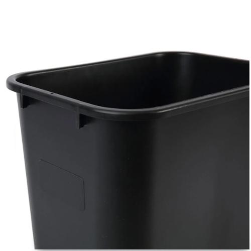 Flexible and durable rectangular waste basket. Sleek design ideal for fitting in tighter spaces. Black plastic with smooth finish. Rim at the top is great for gripping and carrying. A liner can be tied around the top lip for easy disposal. Great for everyday use in offices, kitchens, or bathrooms. Made in USA.