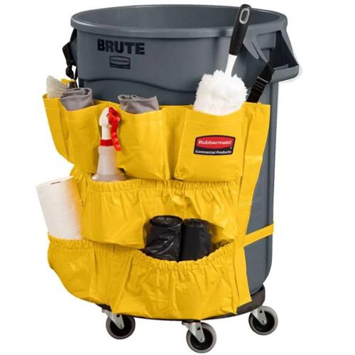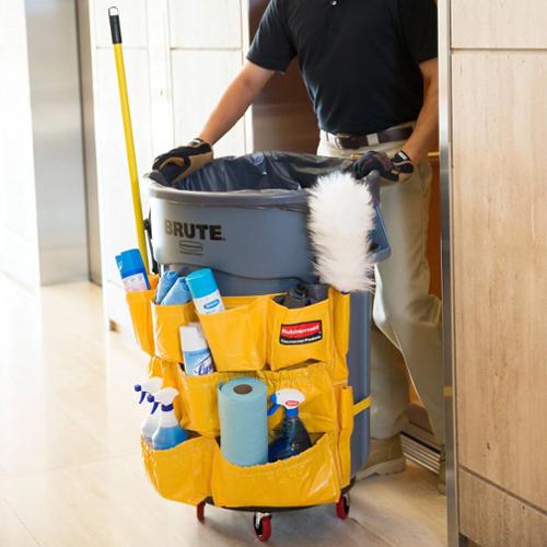 Turn your Rubbermaid Commercial BRUTE container into a cleaning cart with storage and transport for spray bottles, wet-floor signs, lobby dust pan, brushes, liners, gloves, and other cleaning supplies