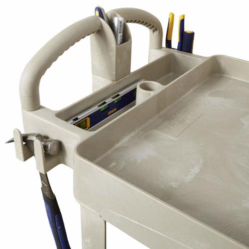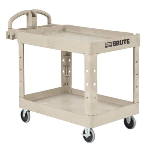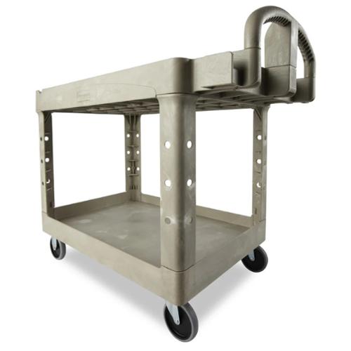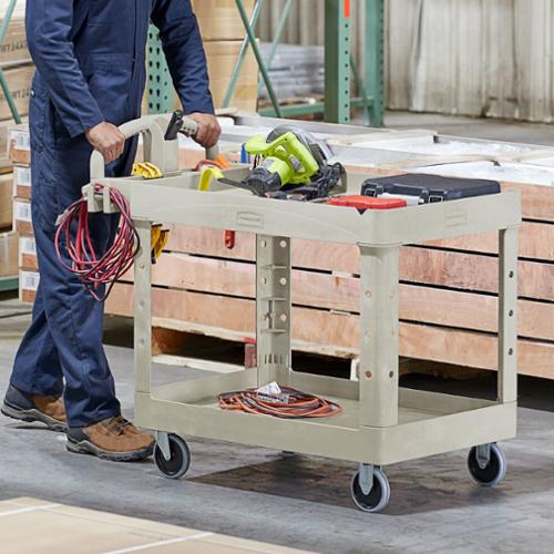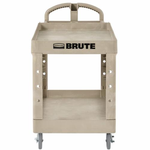 The BRUTE Heavy-Duty Utility Cart with Lipped Shelf transports materials, supplies, and heavy loads securely. The lipped shelves prevent items from falling off the cart and features an integrated V-notch to hold pipe and conduit securely for safe cutting. High-density structural foam construction makes this two-shelf rolling cart sturdy, lightweight, and maneuverable. It wont rust, dent, chip or peel and can support up to 500 lbs. Ergonomically superior design with integrated storage and organizational features allows users to work smarter, faster, and safer.