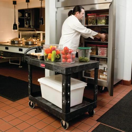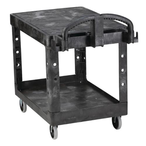 Rubbermaid Commercial Products Heavy-Duty Utility Cart with Flat Shelf transports materials, supplies, and heavy loads securely. The flat shelf provides a large work surface for oversized loads. High-density structural foam construction makes this two-shelf rolling cart sturdy, lightweight, and maneuverable. It wont rust, dent, chip or peel and can support up to 500 lbs. Ergonomically superior design with integrated storage and organizational features allows users to work smarter, faster, and safer.
