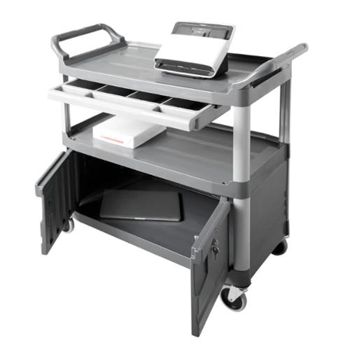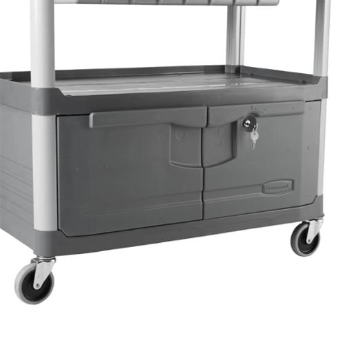 Rubbermaid Commercial Products Xtra Instrument Cart with Lockable Doors and Sliding Drawers is a durable storage and transportation cart for front and back-of-house applications. Sized to carry large loads, this rolling utility cart has sturdy swivel casters for smooth movement and raised arms on both sides for added maneuverability. Convenient sliding drawer adds space for instruments and tools with 100 lb. capacity per shelf.