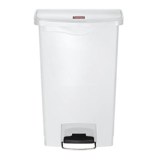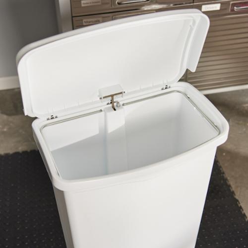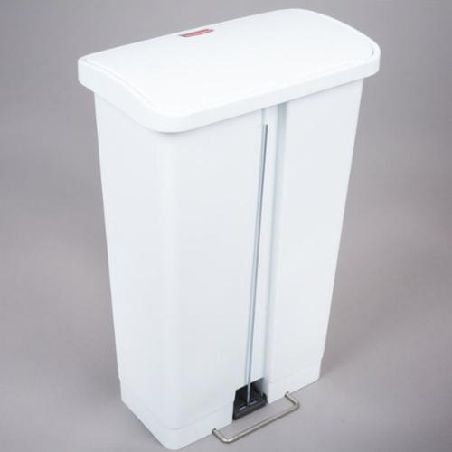 The Rubbermaid Commercial Streamline Front Step-On Container has a small footprint and offers increased pedal clearance for easy foot access and hands-free waste disposal. A tight-fitting lid has a controlled close to reduce noise and an internal hinge design to prevent wall damage. Offering easy maintenance, this step-on container features a liner retainer band to securely hold liner bags.