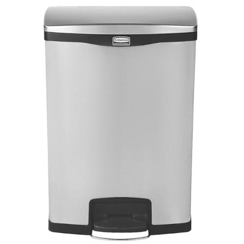 The Rubbermaid Commercial Impressions Front Step-On Container has a small footprint and offers increased pedal clearance for easy foot access and hands-free waste disposal. A tight-fitting lid has a controlled close to reduce noise and an internal hinge design to prevent wall damage. Offering easy maintenance, this step-on container features a liner retainer band to securely hold liner bags.
