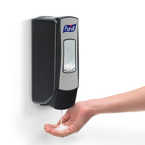 High capacity 700 mL PURELL dispenser is ideal for high traffic areas. Large sight window, skylight and crystal clear refill bottles make it easy to check fill status. Converts to a locking dispenser at any time by simply removing the key from inside the dispenser. ADA compliant for protrusion into walkways. Lifetime guarantee. Patent pending CONTROLLED COLLAPSE refill bottles hold their shape as they empty for a more attractive overall appearance. Removable pump makes recycling easy. SANITARY SEALED refills are made of durable, recyclable PET material, using 30% less plastic than rigid HDPE bottles. Made in USA.