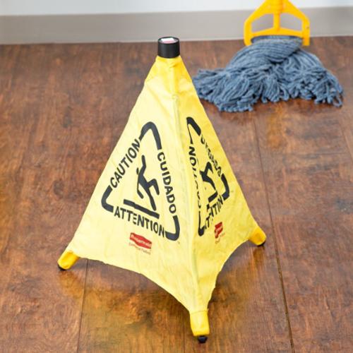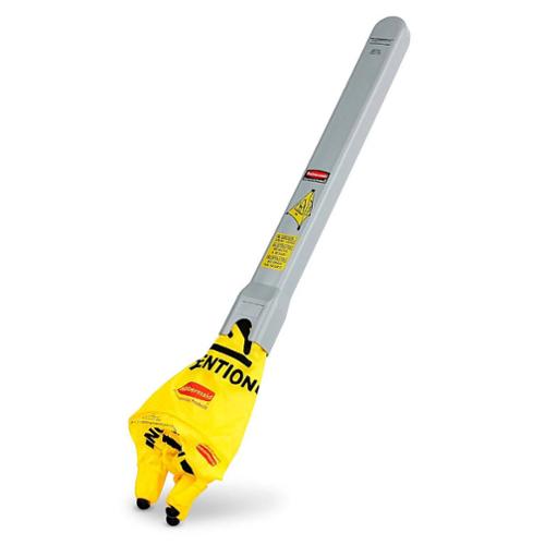 The Rubbermaid Commercial Multilingual "Wet Floor" Pop-Up Safety Cone is a collapsible sign that automatically deploys when removed from wall-mounted storage tube. ANSI/OSHA-compliant color and graphics.