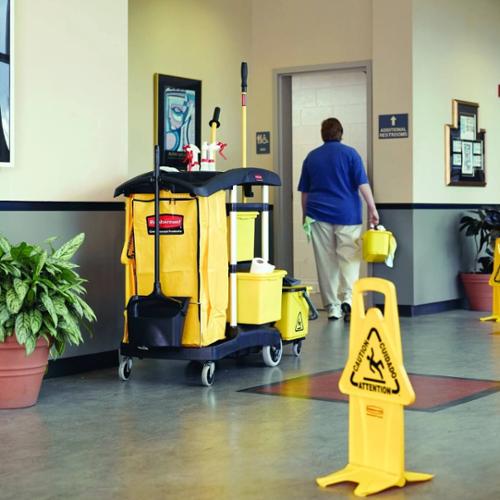 Rubbermaid Commerical Products High-Capacity Janitorial Cleaning Cart with Bins features removable 30-Quart storage bins for added storage organization. This flexible, high-capacity cart is a storage solution and tool organizer that makes it efficient to collect waste and transport cleaning equipment. Customize and stock this cleaning cart in a way that best suits your facility's cleaning needs.