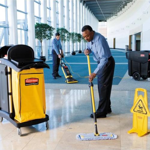 The High-Capacity Janitorial Cleaning Cart offers 40% more space than traditional cleaning carts to save time retrieving supplies.