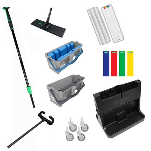 The professional floor cleaning Kit includes (1) Excella Straight Pole OmniClean w/Storage Clip (1) Mop Pad Holder (2) Microfiber Pads (1) SmartColor rectangular labels (1) Carriage with Wringer (2) Gray Bucket (1) Gray Bucket Handle (1) Gray Bucket Scrub Board (1) Blue Charge Guide (1) Blue Bucket Handle (1) Straight Carriage Handle (4) Casters