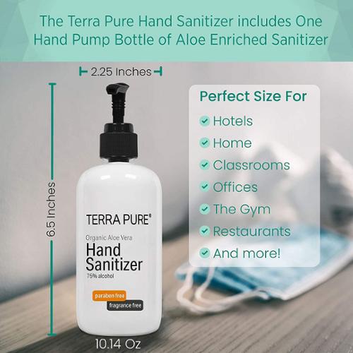 Terra Pure moisturizing formulas are enriched with organic aloe vera extract and vitamin E, leaving skin feeling soft and clean. Fragrance Free, 70% Alcohol based. 10.14 oz/ 300 ml Pump Top. This bottle works well with the Eco Well True bracket system.