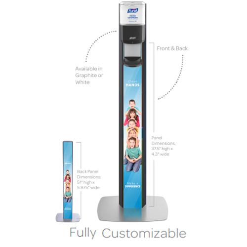 Elegant stand makes PURELL Hand Sanitizer available anywhere. Includes PURELL ES8 Hand Sanitizer Dispenser - Graphite. May be personalized with your message on the front and back of the stand. Chosen by consumers as a more sleek and modern design when compared to leading touch-free floor stands on the market. Low profile baseplate designed to maximize stability. Accessorize with the Small PURELL MESSENGER Stand Signs. Uses PURELL ES8 1200mL Hand Sanitizer refills. SANITARY SEALED PET refill bottle with the tear-off collar for easy recyclability. Made in USA.