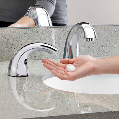 Touch-Free Dispenser for GOJO Foam Soap. Premium touch-free, battery-powered dispenser. Durable, solid metal design. Submersible, waterproof spout sensor. Drip-free, mess-free operation. Adaptable swivel motor housing design allows 360-degree rotation. High-capacity refill gives 2,300-3,800 hand washes. Extended battery life - 45,000 uses. Compatible with GOJO CX 1500 and 2300 mL refills. Made in USA.