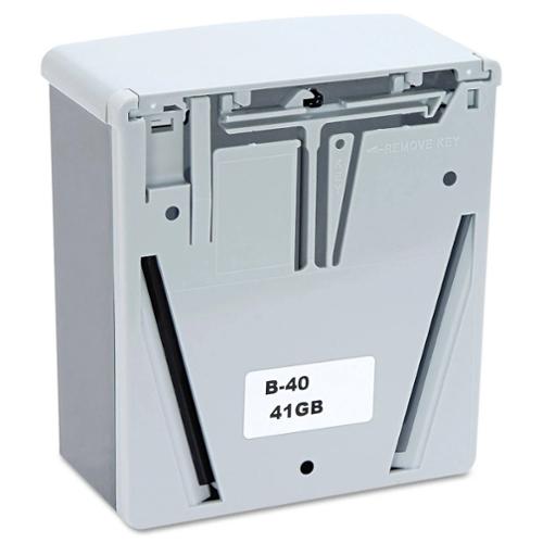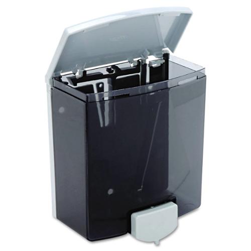 Two-tone black and grey. Valve dispenses all-purpose soaps. Vandal resistant lid has keyless locking device, pivots up for easy top filling. Translucent container provides visible soap level. Capacity: 40-fl oz (1.2-L). Concealed wall/mirror mounting, removable for cleaning. Unit 5 13/16" W, 6 7/8" H (150 x 175mm); wall to push-button, 3 3/16" (80mm). Made in USA