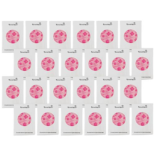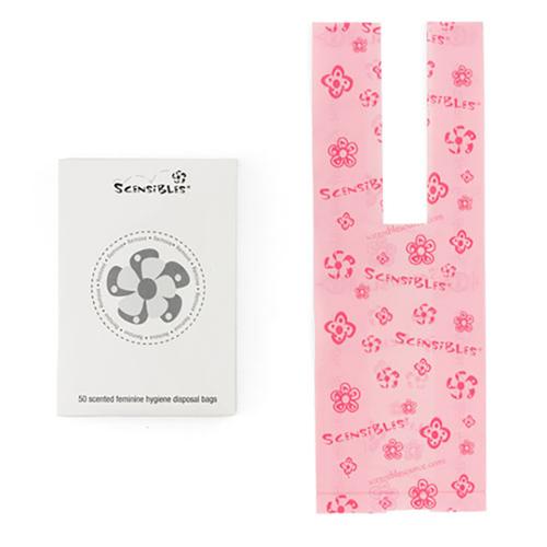 Personal Disposal Bags. Single-use bag for sanitary pads, tampons, panty liners and wipes. Contemporary pink on pink flower pattern masks the contents. Easy 4" handle-tie closures help completely conceal contents. Pleasant fresh fragrance. Built-in antimicrobial agents inhibit the growth of odor-causing bacteria. Interleave folded in refill box for easy dispensing.