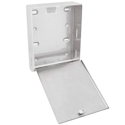 Satin-finish stainless steel. Dispenses 400 C-fold or 525 multifold towels. Door has knob-latch and piano-hinge. Hemmed towel tray opening. Dimensions (WxDxH) 10.750" x 4.000" x 14.000". 1 dispenser each.