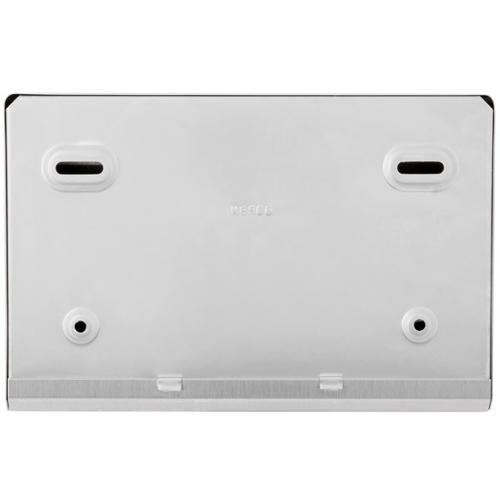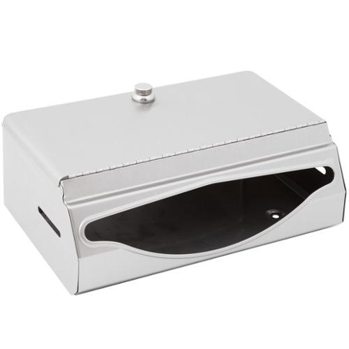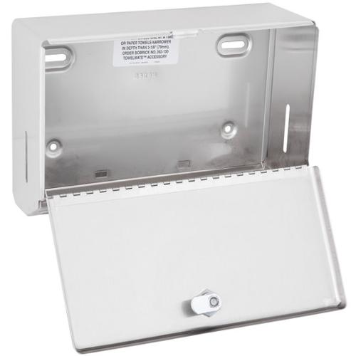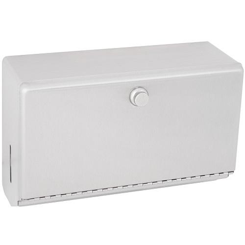 Satin-finish stainless steel. Dispenses 200 C-fold or 275 multifold towels. Door has knob-latch. Hemmed towel tray opening. Dimensions (WxDxH) 7.125" x 4.000" x 10.750".