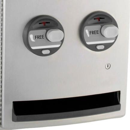 14-3/8" W x 28-3/8" H. Equipped with stainless steel skirt for semi-recessing in 4" (100mm) deep walls. Push-Button Operation, Less Than 5 Lb of Force, No Grasping, Pinching or Twisting of the Wrist. Easy access Product tray. Single-coin slots are key to jam-resistant operation. Accepts one or two quarters (U.S. or Canadian). Push-button coin return cancels Product selection. Holds 30 tampons, 20 napkins. Two flush tumbler door locks keyed like other Bobrick accessories. type 304 satin-finish stainless steel on exposed surfaces. Patented.