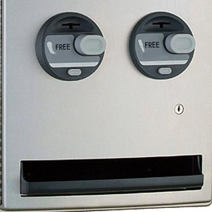 8" L x 14-1/2" W x 28-1/2" H. Equipped with stainless steel skirt for surface mounting. Push-Button Operation, Less Than 5 Lb of Force, No Grasping, Pinching or Twisting of the Wrist. Easy access Product tray. Single-coin slots are key to jam-resistant operation. Accepts one or two quarters (U.S. or Canadian). Easy Product loading, no weights. Holds 30 tampons, 20 napkins. type 304 satin-finish stainless steel on exposed surfaces. Patented.
