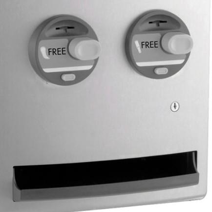 14-3/8" W x 28-3/8" H. Push-Button Operation, Less Than 5 Lb of Force, No Grasping, Pinching or Twisting of the Wrist. Easy access Product tray. Single-coin slots are key to jam-resistant operation. Accepts one or two quarters (U.S. or Canadian). Holds 30 tampons, 20 napkins. Two flush tumbler door locks keyed like other Bobrick accessories. Type 304 satin-finish stainless steel on exposed surfaces. Patented.