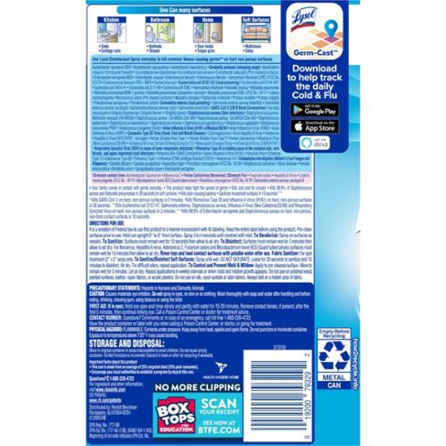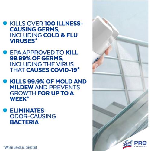 This tuberculocidal, virucidal, fungicidal and bactericidal formula kills 99.9% of germs on hard, nonporous surfaces and is effective against over 50 microorganisms including H1N1 (Influenza A virus) MRSA, Norovirus, Rhinovirus, Poliovirus Type 1, Hepatitis A virus, Hepatitis B virus and HIV-1 (AIDS Virus).* This product eliminates odors and prevents the growth of mold and mildew. Use on showers, sinks, countertops, around toilet areas, toys, telephones, garbage bins, waiting rooms and in laboratories. Lysol disinfectant spray is a hospital-grade spray and kills 99.9 percent of viruses, including norovirus, which causes the stomach flu. It also eliminates 99.9 percent of bacteria and fungi, helping to control the growth of mold and mildew, remove odors, and prevent seasonal colds, flu, and allergies. 19 oz. USDA Certified Biobased Product. Made in USA.