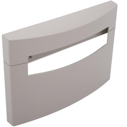 Durable ABS plastic; grey color. Dispenses 250 single- or half-fold toilet seat covers or one box. Fills from bottom. Allow 5" minimum clearance from bottom of dispenser to top of any horizontal projection for filling dispenser from below unit. Dimensions (WxDxH) 16.125" x 2.500" x 11.500".