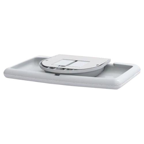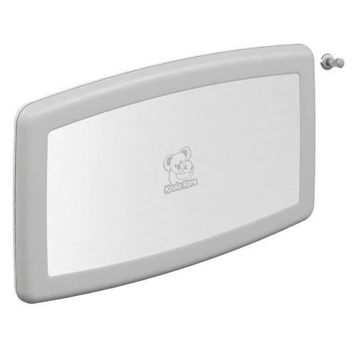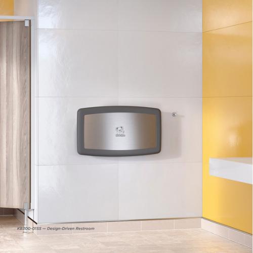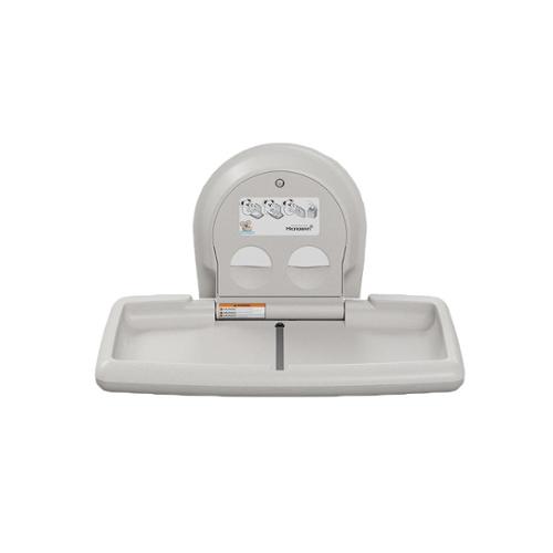 Baby Changing Station, 35-15/16"W x 4"D x 20-3/4"H, horizontal, surface-mounted, polypropylene with Microban antimicrobial protection, unibody steel chasis supports 200 lbs, gas spring mechanism, dual liner cavity with lock, safety straps, bag hook, white/granite