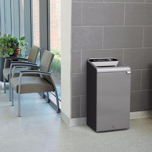 The Rubbermaid Commercial Configure Waste Receptacle, Landfill Trash Can, 23 Gallon provides a stylish way to collect recyclables in low-to-medium traffic areas. Constructed of corrosion-resistant heavy gauge steel with a damage-resistant powder coat finish and contoured edges for a modern appearance, the garbage can fits any commercial environment. This single stream recycle bin has a color-coded label and a large open top for collecting recyclables. Magnetic connections allow receptacles to attach to one another and stay arranged in the order that best fits the space in a row or an island. An easy-access front door and handle reduces strain on staff, while internal door hinges protect walls from damage. Inside the trash bin, a rigid plastic liner features handles for more comfortable trash removal, integrated cinches so bags won't slip and venting channels that allow air to flow into the can making removal easier. This container ships fully assembled.