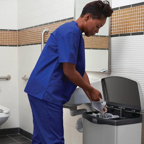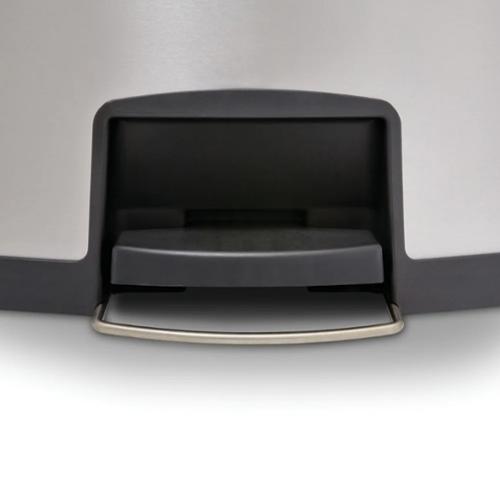 The Rubbermaid Commercial Impressions Front Step-On Container has a small footprint and offers increased pedal clearance for easy foot access and hands-free waste disposal. A tight-fitting lid has a controlled close to reduce noise and an internal hinge design to prevent wall damage. Offering easy maintenance, this step-on container features a liner retainer band to securely hold liner bags.