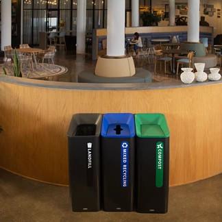 Rubbermaid Commercial Products Sustain Containers are a decorative and adaptable recycling solution made to improve your facility's sustainability compliance. Modular system allows the container stations to be customized and grow with each recycling program's needs. Restrictive waste stream openings and colored labels provide easy visual cues for patrons, making recycling easier and improving compliance with growing regulations.