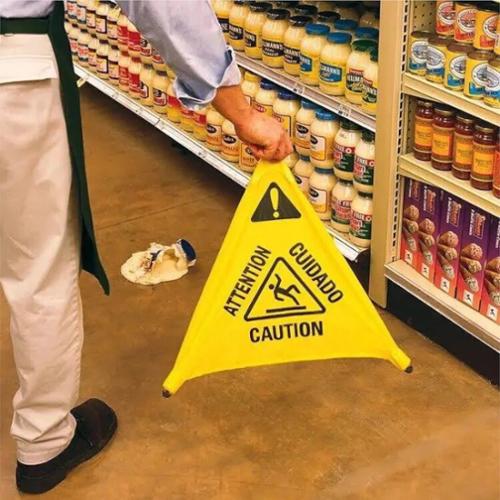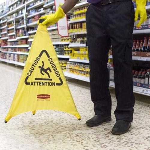 The Rubbermaid Commercial Multilingual "Wet Floor" Pop-Up Safety Cone is a collapsible sign that automatically deploys when removed from wall-mounted storage tube. ANSI/OSHA-compliant color and graphics.