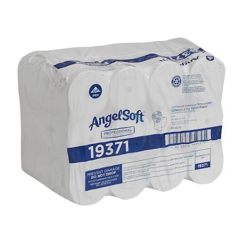 Choose Angel Soft Professional Series Compact Coreless 2-Ply Premium Embossed Toilet Paper for improved softness. Specifically designed to increase toilet paper capacity, Compact Coreless Toilet Paper allows you to utilize a variety of dual roll or high capacity 4 roll dispensing options or convert existing dispensers with the use of specially designed dispenser spindles. Sheet size: 4.000" x 3.800". 750 sheets per roll, 36 rolls per case
