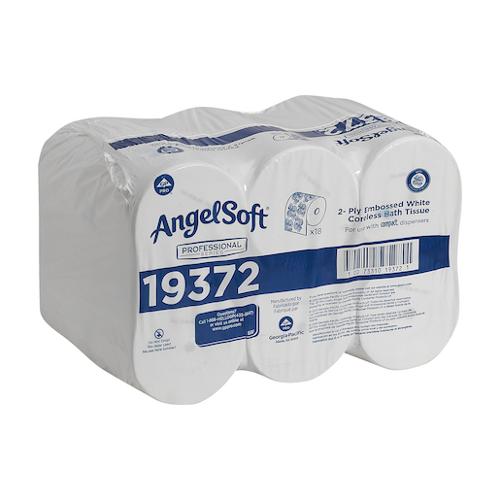 Choose Angel Soft Professional Series Compact Coreless 2-Ply Premium Embossed Toilet Paper for improved softness. Specifically designed to increase toilet paper capacity, Compact Coreless Toilet Paper allows you to utilize a variety of dual roll or high capacity 4 roll dispensing options or convert existing dispensers with the use of specially designed dispenser spindles. USDA certified. Sheet size: 4.000" x 3.800". 1125 sheets per roll, 18 rolls per case.