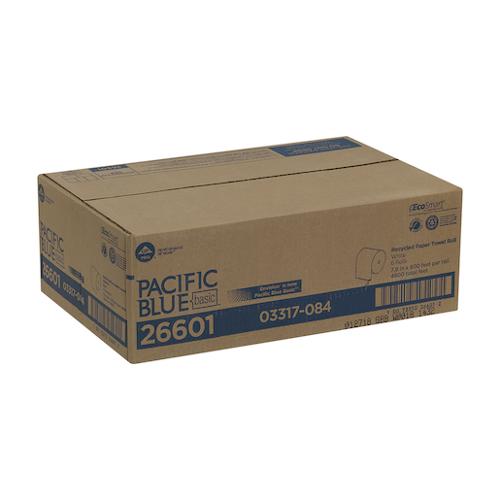 Designed to fit into a wide range of everyday dispensers, Pacific Blue Basic high capacity white economy hardwound towels help you keep costs under control. Low per-unit costs makes these towels the affordable choice for areas such as washrooms in government and public facilities, office buildings, foodservice facilities and lodging. Envision hardwound roll towels let you offer your customers quality and reliable performance at a low cost. Green Seal certified. Sheet size: 7.870"