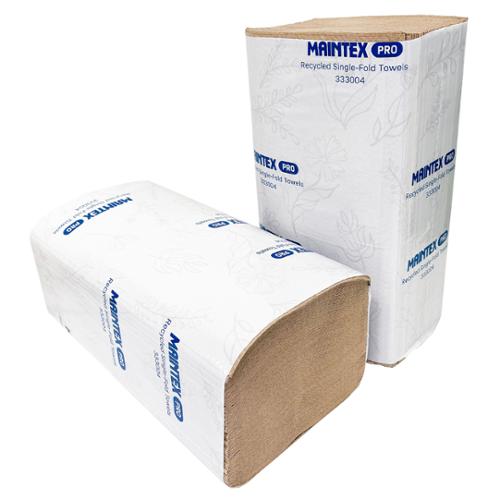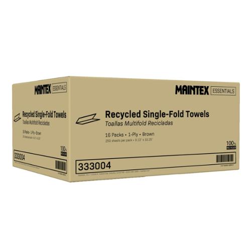 Maintex Essentials Singlefold Paper Towels are a high quality and economical towel option to keep costs under control. Designed for efficient, one-at-a-time dispensing, these durable kraft paper towels provide reliable hand-drying while reducing waste. Made with 100% recycled content and FSC certified, supporting responsible forestry. Sheet Size: 1-Ply, 9.13 x 10.25. This item replaces 340192.