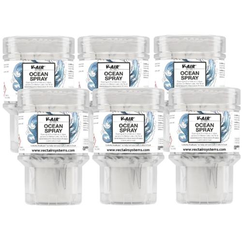 The multi-award winning Vectair V-Air SOLID utilizes pioneering multi-phasing air freshener technology through a Vectair V-Air SOLID Multi-Phasing Passive Dispenser and solid fragrance cartridge, delivering consistent fragrance intensity for up to 60 days. Vectair V-Air SOLID is free of batteries and propellants. VOC exempt. The Ocean Spray fragrance opens with a mixture of clove, jasmine and lemon peel. What subtly follows, is a floral blend blossoming into a wave of soapy, cool marine musk.