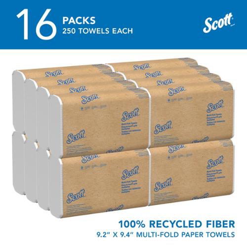 Scott Essential 100% Recycled Fiber Multifold Paper Towels are an economical choice. They are made with 100% recycled fiber (RF), so you can feel good about choosing them for your business. Plus, they fit into any universal dispenser for trifold paper towels or multifold towels (which helps control over use). Made with a minimum of 40% post-consumer waste, Scott Essential folded paper towels meet EPA minimum standards and are FSC and Eco Logo certified, you know theyre good choice for an economical paper towel. Sheet size: 9.200" x 9.400".