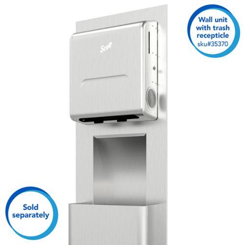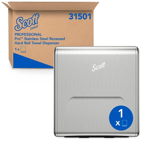 The Scott Pro Hard Roll Paper Towel Dispenser system from Scott Pro is designed to adapt and change with your needs. This Recessed Dispenser Housing unit works with dispensing modules (Manual and electronic Automatic Modules all sold separately) to give you plug-and-play flexibility to build a complete customized stainless steel dispenser solution to meet your workplace paper towel needs. It is made from 22-guage brushed stainless steel, which is both durable and stylish. The housing and its respective module will dispense one 8 diameter roll of 700 feet or 1150 feet of Kleenex or Scott Brand paper towels, plus the stub roll, using the core plug mounting. Since its recessed into the wall, its a smart, space-saving design for your restroom or break room. The system combines touchless technology with the bacteria-reducing benefits of drying with paper towels, supporting and promoting better hand and surface hygiene. Dispenser (WxDxH) 13.97" x 16.10" x 4.88"